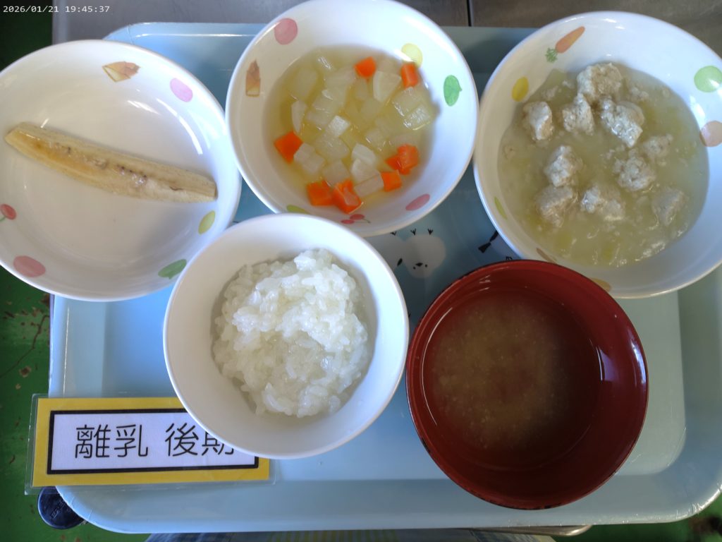 ホーム虹の子保育園今日の給食 1/22(木)の今日の給食 2026年1月22日 【今日の給食】ご飯 豚肉の生姜焼き ほうれん草のごま和え みそ汁 バナナ 【離乳食 後期】おかゆ 鶏肉と玉ねぎの煮物 にんじんと大根のだし煮 みそ汁 バナナ 【今日のおやつ】牛乳 高野豆腐のコロコロ揚げ 【離乳食 後期】乳児用菓子