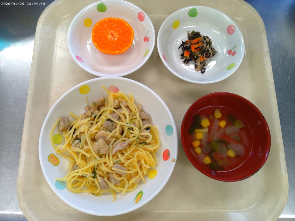 【今日の給食】鶏肉ときのこの和風スパゲティ ひじきのサラダ スープ みかん