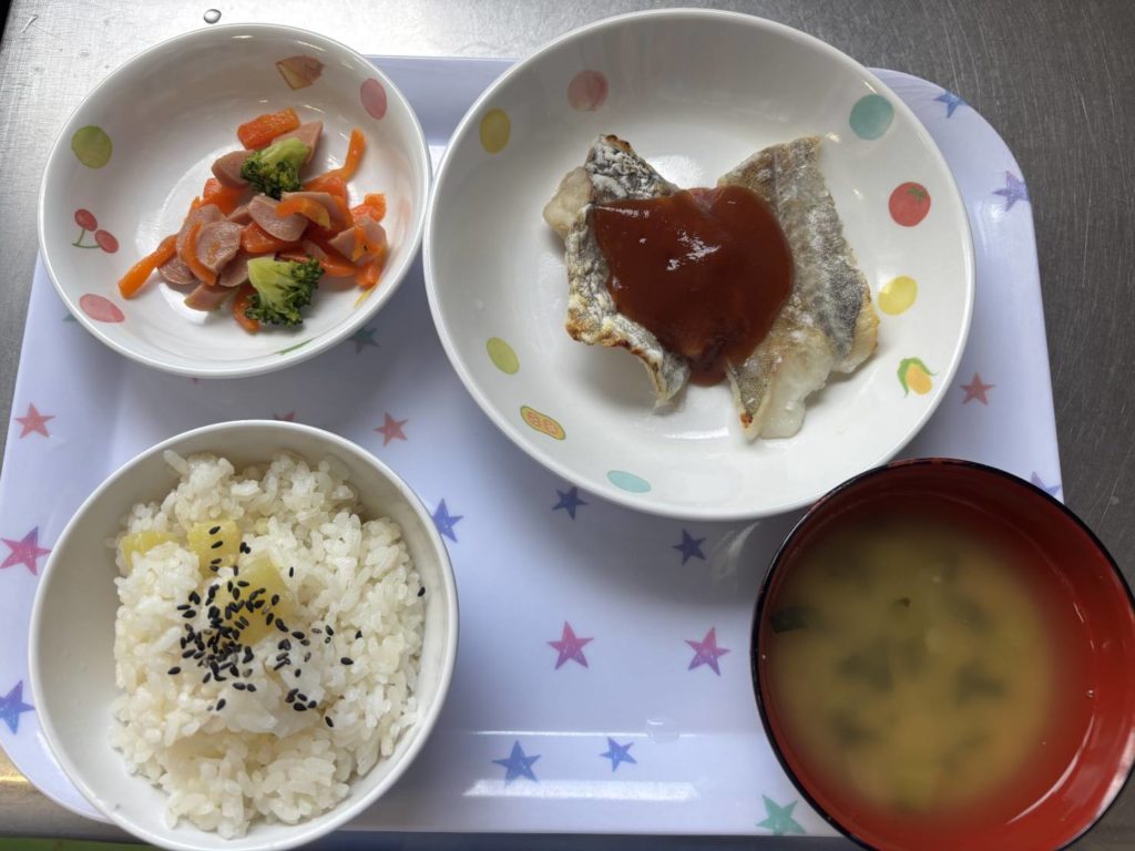 【今日の給食】さつま芋ご飯 助宗タラのムニエル ウインナーとブロッコリーのソテー みそ汁