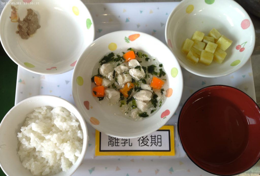 【離乳食 中期】おかゆ 鶏肉と小松菜の煮物 鶏レバーペースト さつま芋のほくほく煮 だし汁