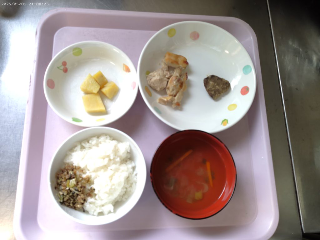 【今日の給食】ふりかけご飯 チキンの照り焼き 鶏レバーの味噌煮 さつま芋のレモン煮 スープ