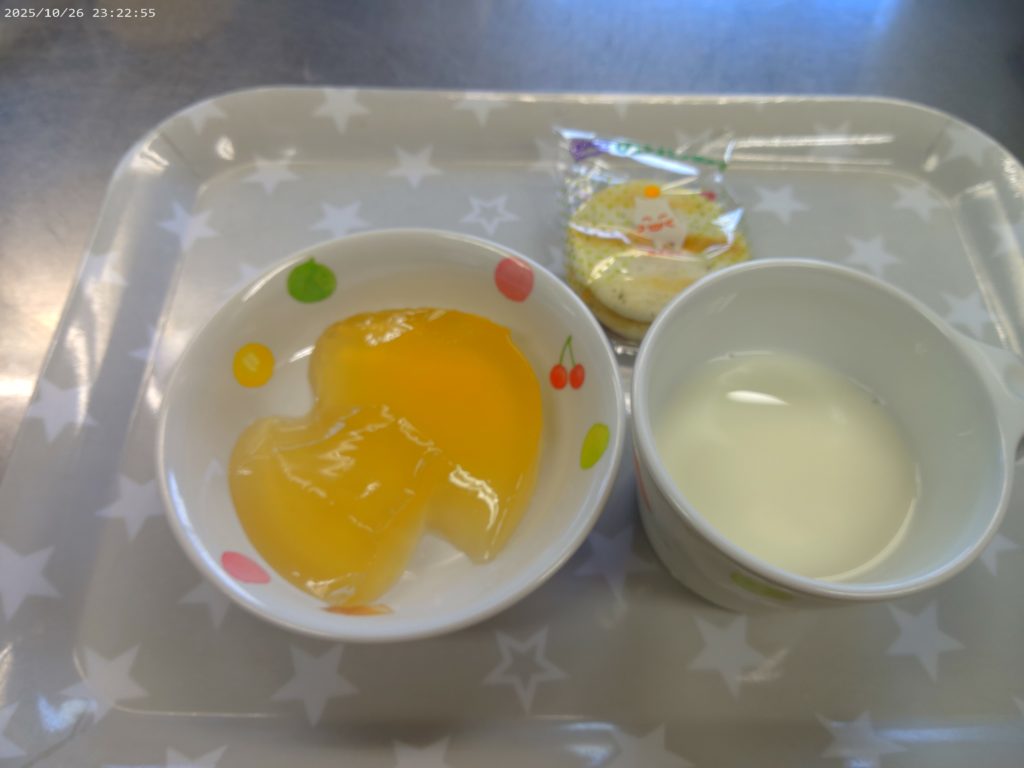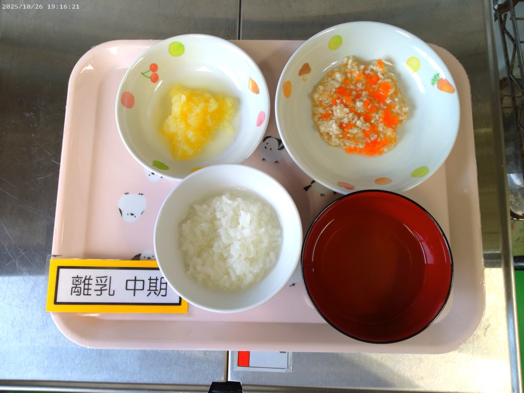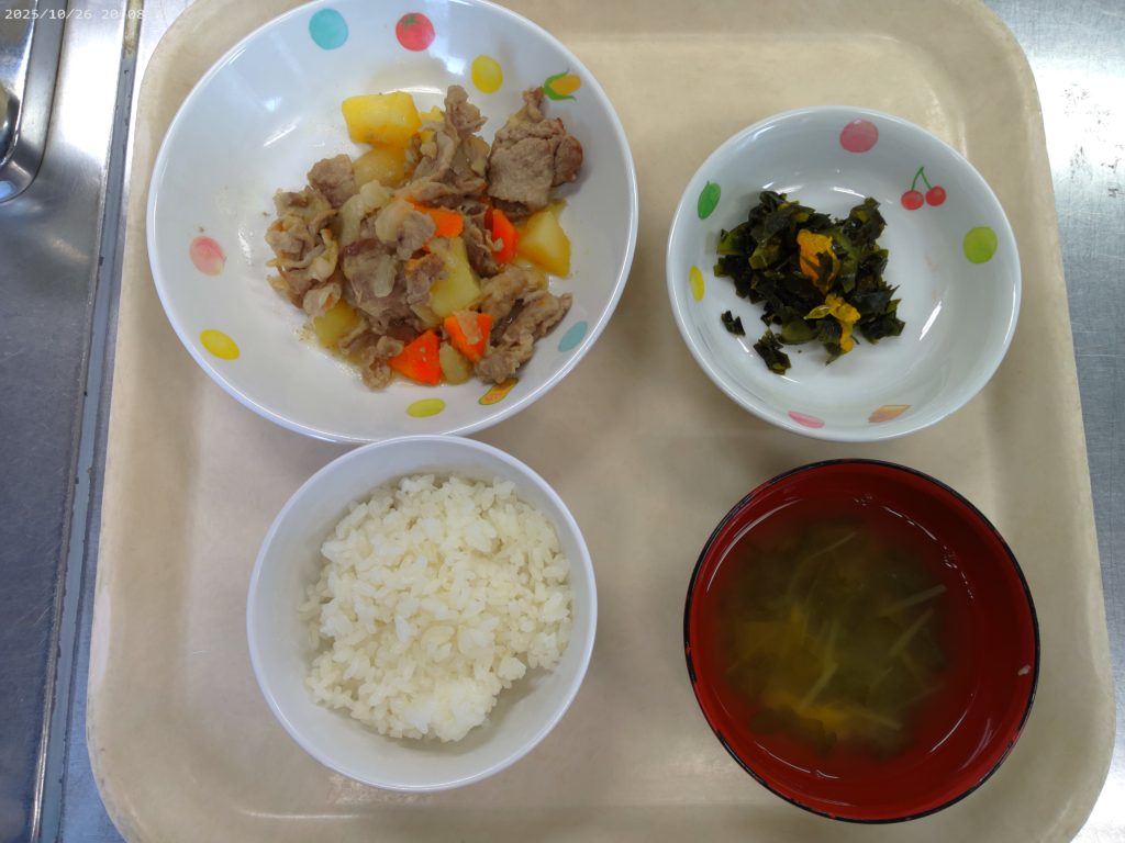 ホーム虹の子保育園今日の給食 10月27日(月)の給食 2025年10月27日 【今日の給食】ご飯 肉じゃが わかめときゅうりの甘酢和え みそ汁 【離乳食 中期】おかゆ 鶏肉と人参の煮物 じゃが芋の含め煮 だし汁 【午後おやつ】牛乳 りんごゼリー おせんべい