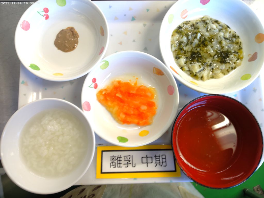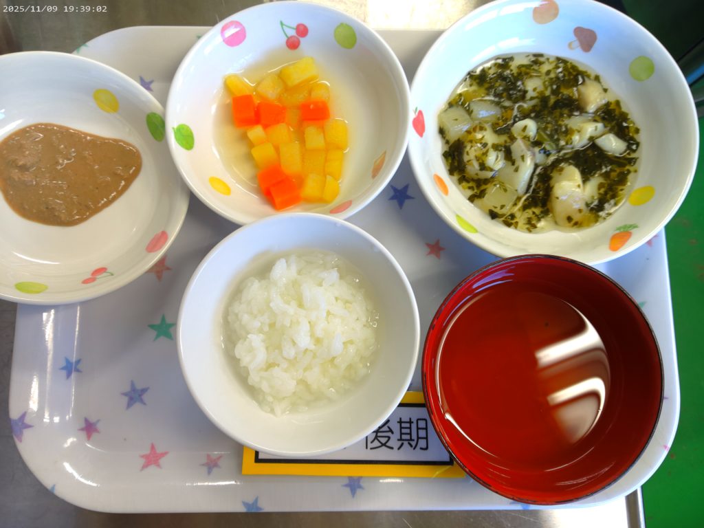 【離乳食 後期】おかゆ タラと大根の煮つけ 鶏レバーペースト さつま芋と人参のだし煮 すまし汁