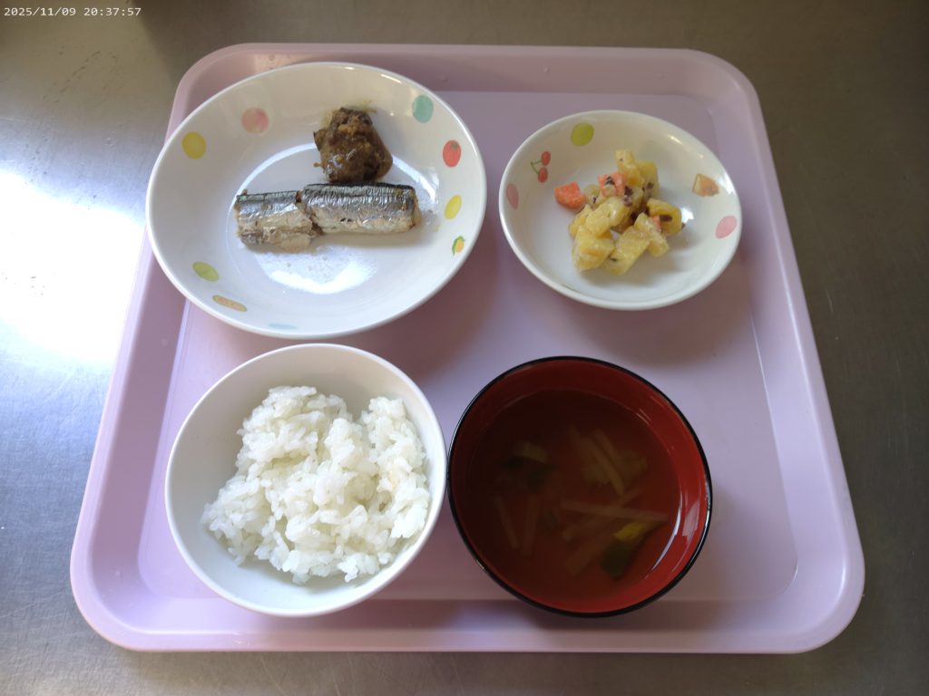 【今日の給食】ご飯 焼きさんま 鶏レバーの味噌煮 さつま芋のサラダ すまし汁