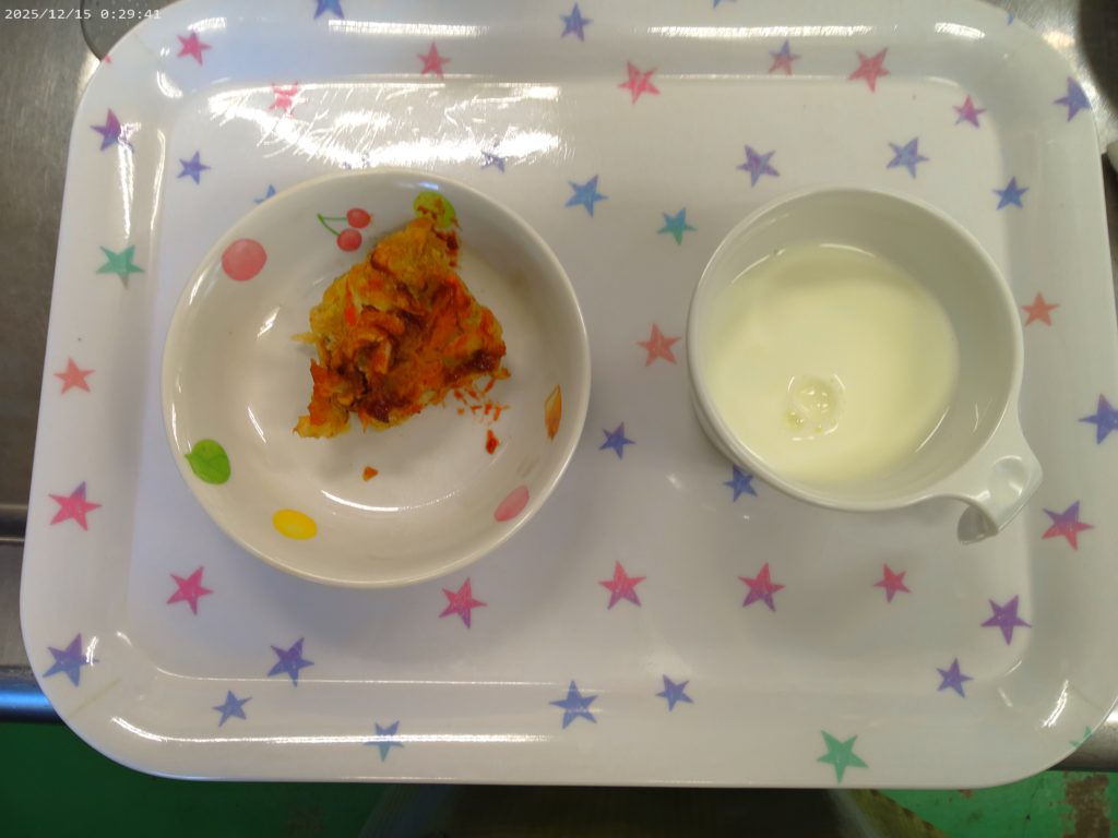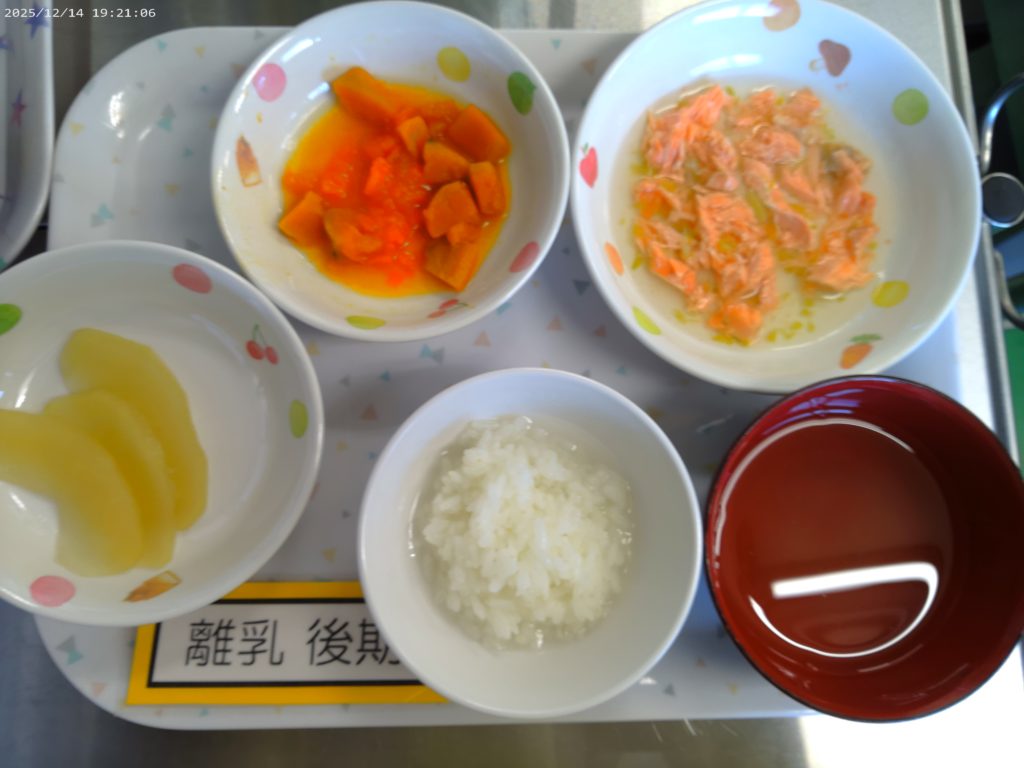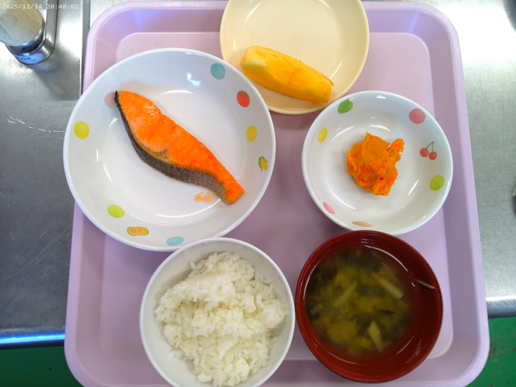 ホーム虹の子保育園今日の給食 12月15日(月)の給食 2025年12月15日 【今日の給食】ご飯 焼き鮭 野菜のごまマヨサラダ みそ汁 りんご 【離乳食 後期】おかゆ 鮭の煮つけ 野菜のだし煮 みそ汁 りんご煮 ※本日はブロッコリーを使用しておりません 【午後おやつ】牛乳 お好み焼き