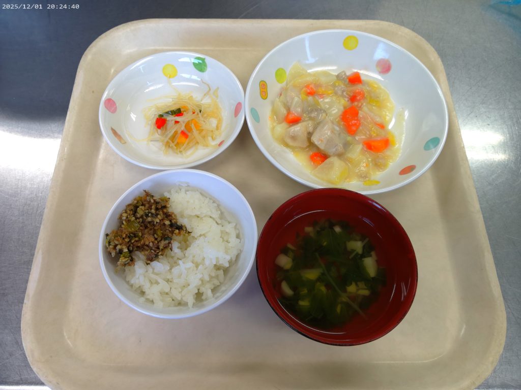 ホーム虹の子保育園今日の給食 12月2日(火)の給食 2025年12月2日 【今日の給食】手作りふりかけご飯 鶏肉と冬野菜のクリーム煮 春雨の彩り和え スープ 【離乳食 後期】おかゆ 鶏肉と冬野菜の煮物 小松菜のお浸し だし汁 【午後おやつ】牛乳 じゃが芋餅 【午後おやつ 離乳食 後期】牛乳 マッシュポテト