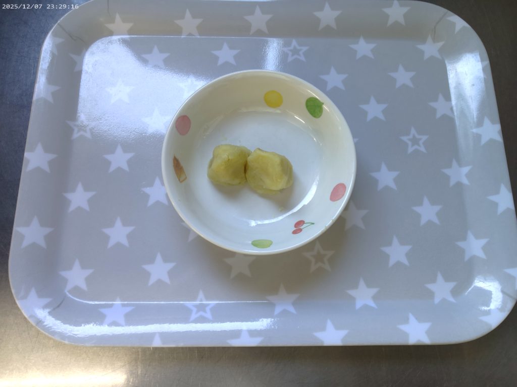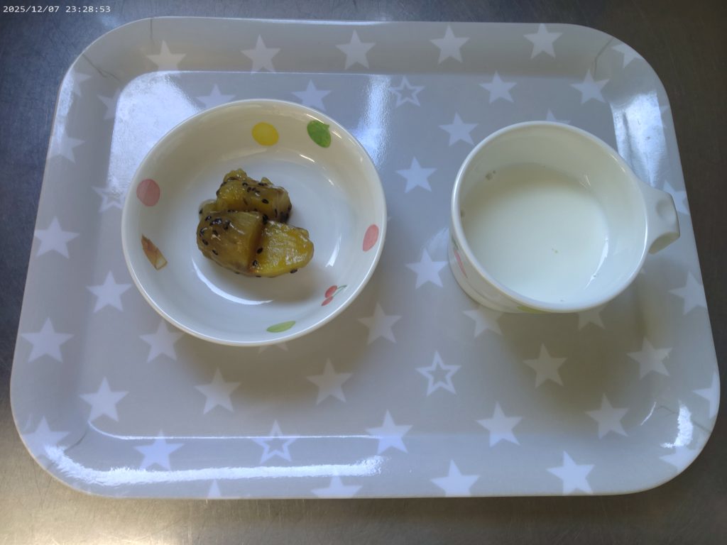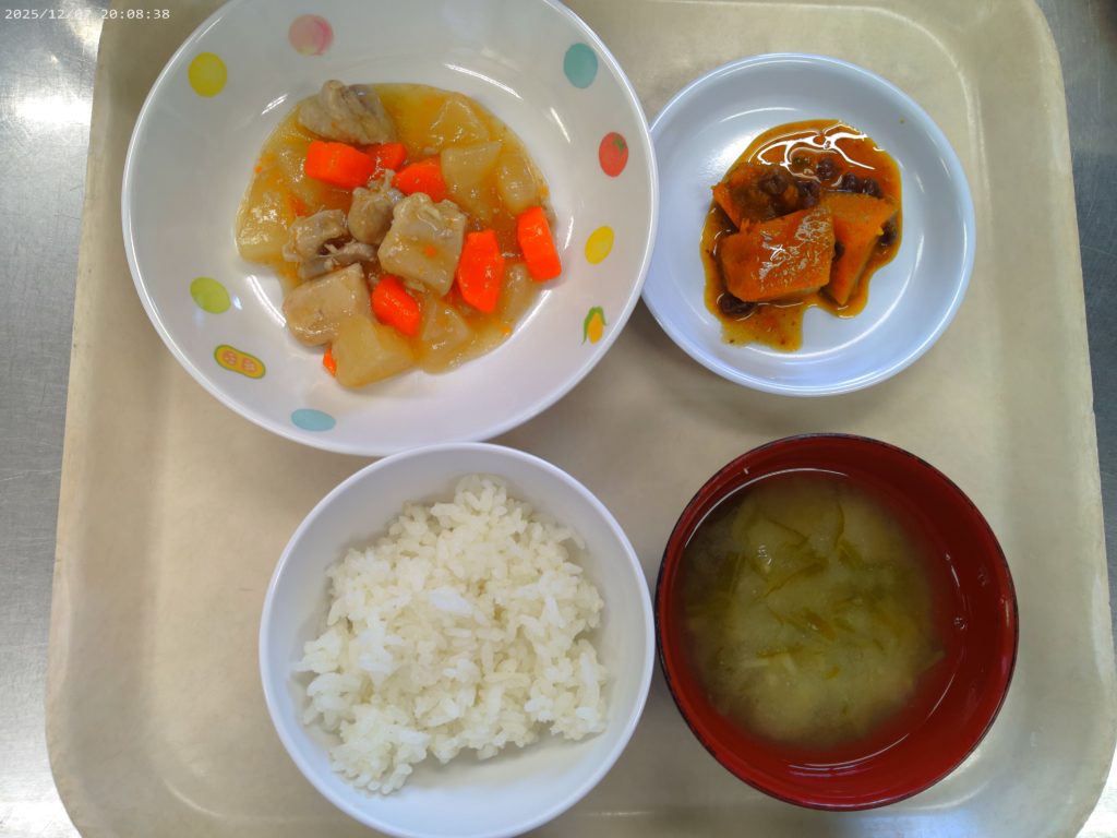ホーム虹の子保育園今日の給食 12月8日(月)の給食 2025年12月8日 【今日の給食】ご飯 炒り鶏 かぼちゃのいとこ煮 みそ汁 【離乳食 後期】おかゆ 鶏肉と大根の煮物 かぼちゃ煮 みそ汁 【午後おやつ】牛乳 大学芋 【午後おやつ 離乳食 後期】ミルク さつま芋の茶巾