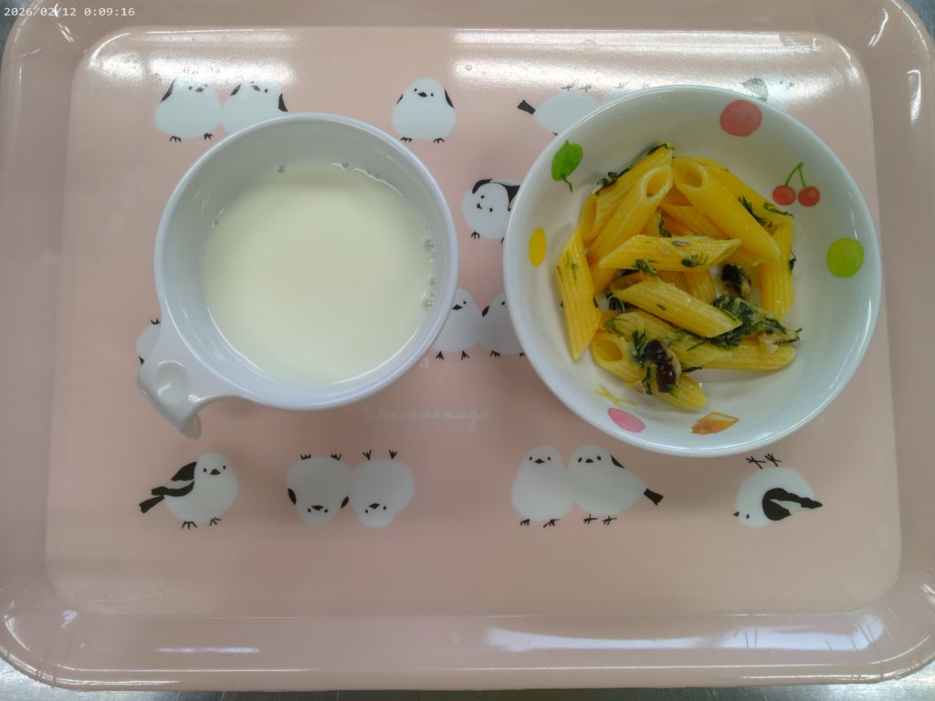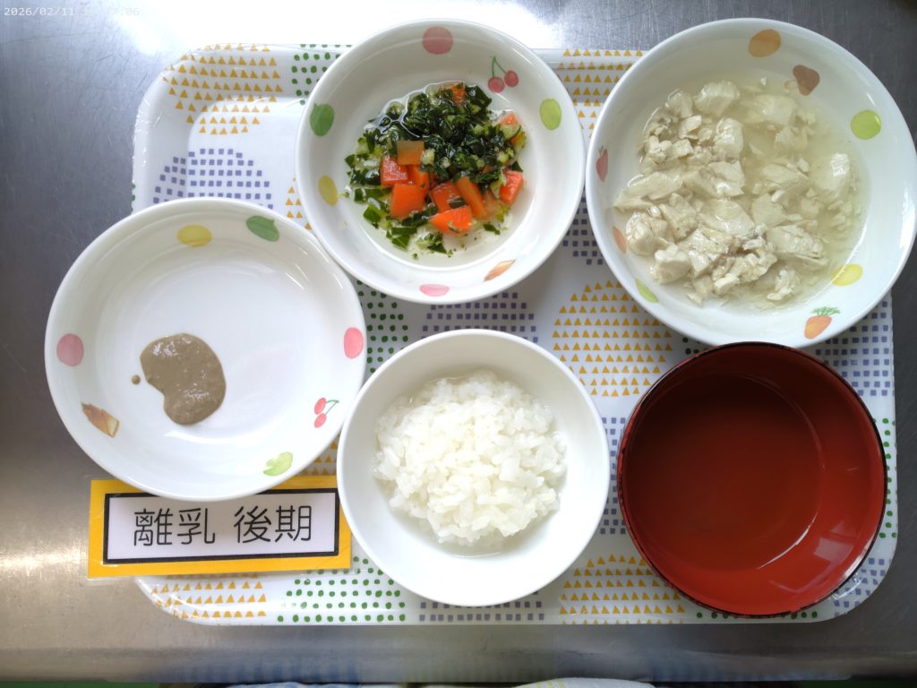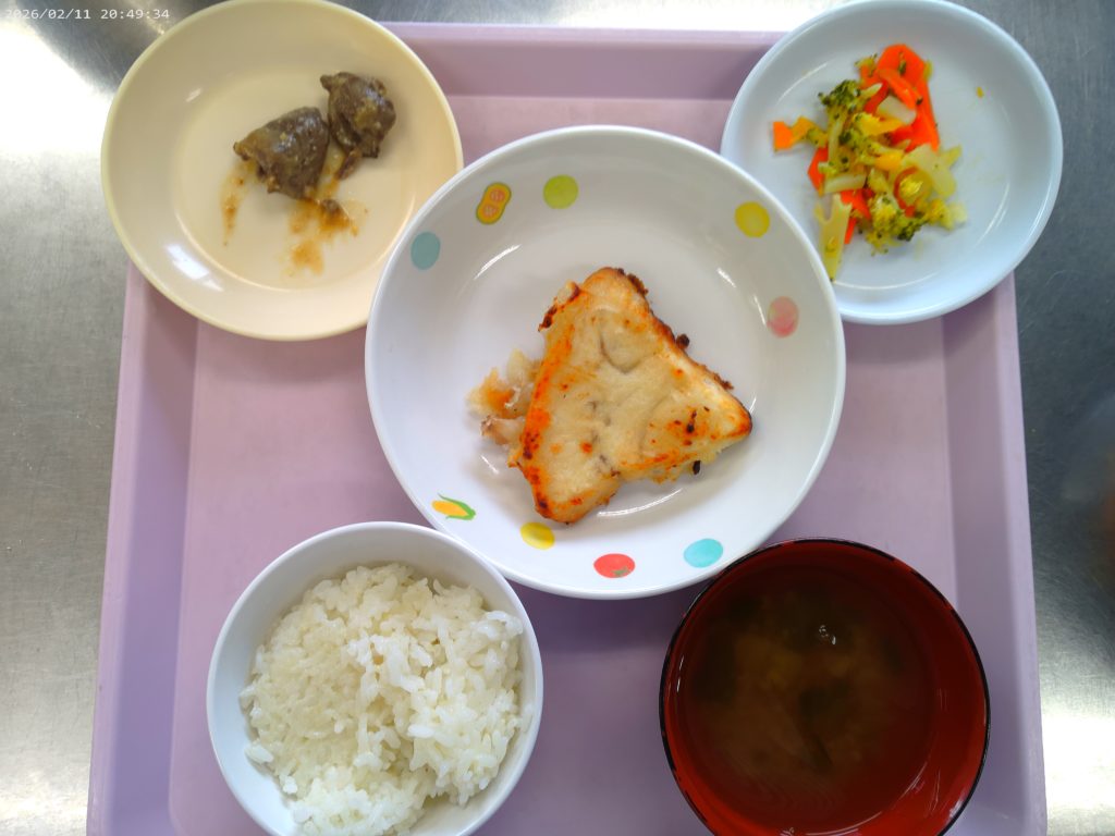 ホーム虹の子保育園今日の給食 2月12日(木)の給食 2026年2月12日 【今日の給食】ご飯 カジキの竜田揚げ 鶏レバーの味噌煮 ブロッコリーの彩り和え すまし汁 【離乳食 後期】おかゆ かじきの煮物 鶏レバーペースト ブロッコリーと人参のやわらか煮 すまし汁 【午後おやつ】牛乳 きのことチキンの和風パスタ