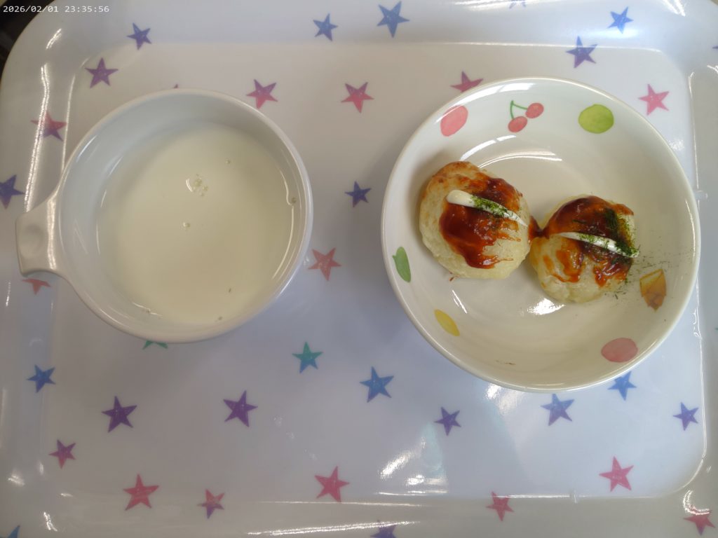 ホーム虹の子保育園今日の給食 2月16日(月)の給食 2026年2月16日 【今日の給食】ご飯 鮭マヨネーズ焼き 春雨サラダ スープ 【離乳食 後期】おかゆ 鮭と玉ねぎの煮つけ キャベツと人参のお浸し だし汁 【午後おやつ】牛乳 たこ焼き風ポテト 【午後おやつ 離乳食 後期】ミルク マッシュポテト