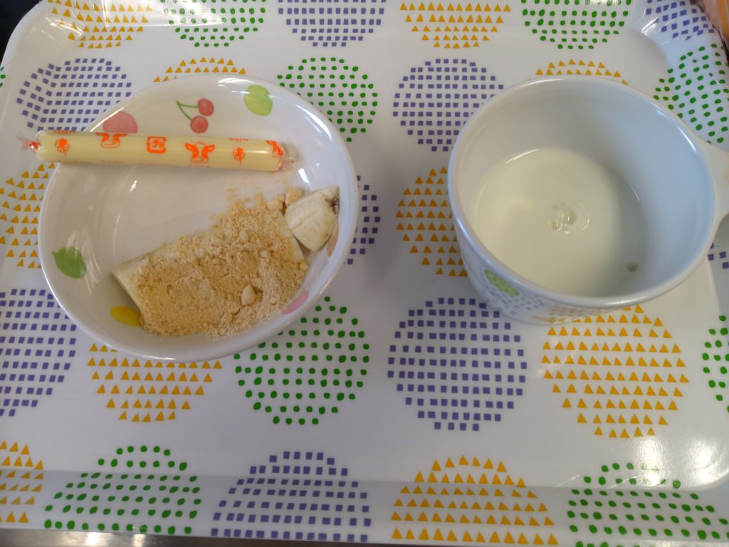 【今日のおやつ】牛乳 バナナきな粉 チーズ