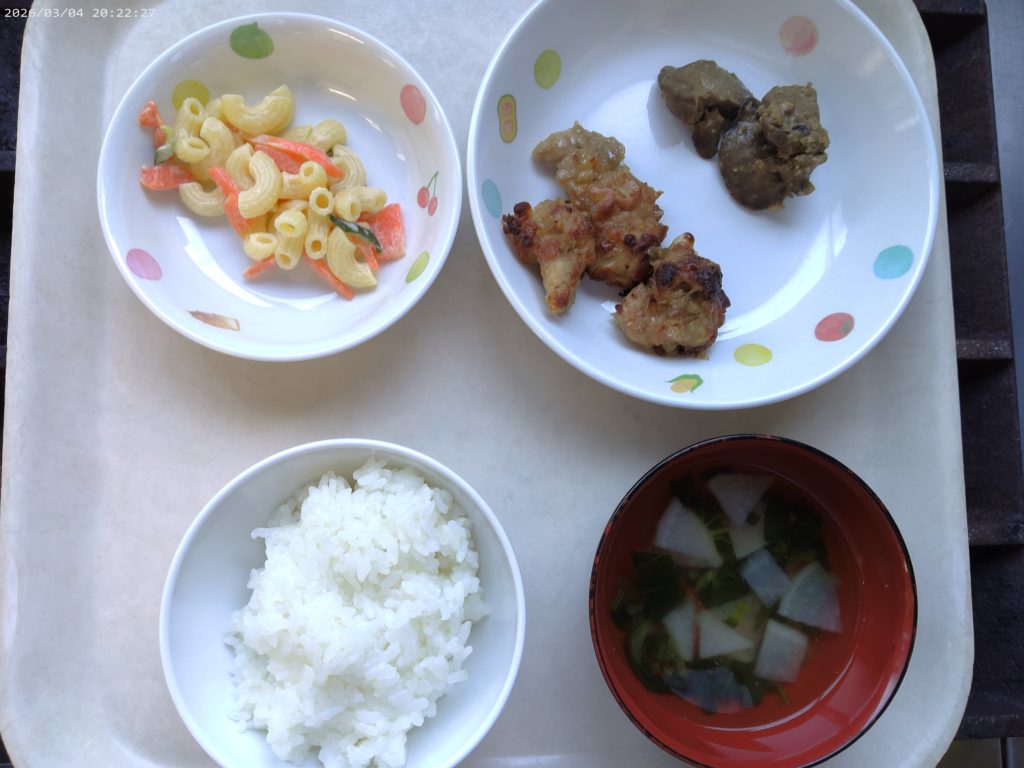 【今日の給食】ご飯 鶏のから揚げ 鶏レバーの味噌煮 マカロニサラダ スープ