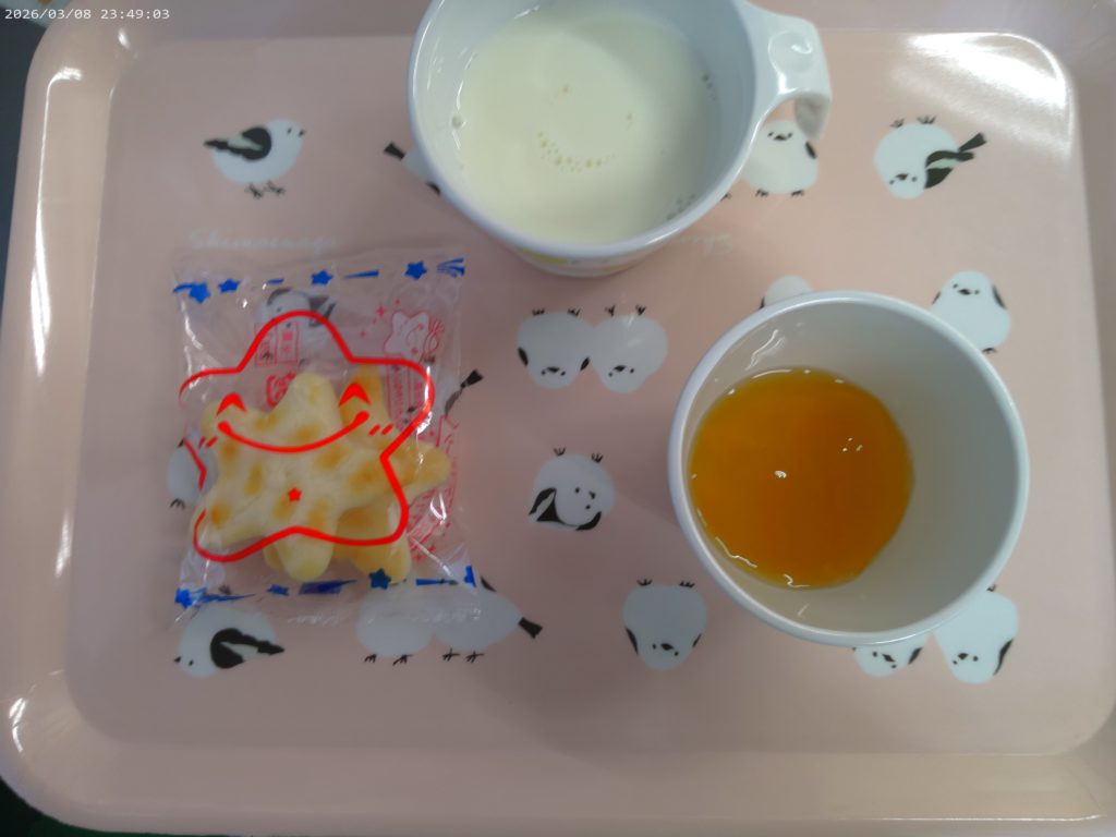 【午後おやつ】牛乳 りんごゼリー おせんべい