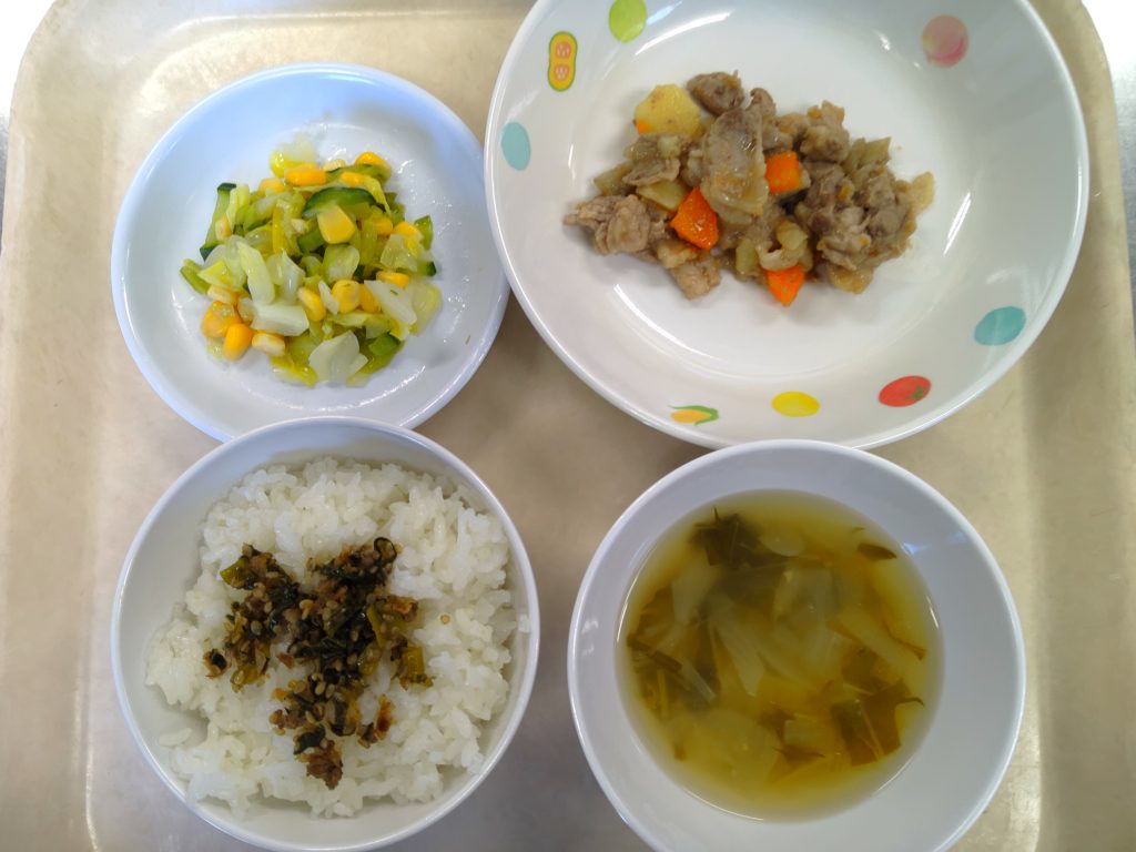 【昼食】手作りふりかけご飯 豚肉とじゃが芋の煮物 さっぱりコーンサラダ すまし汁