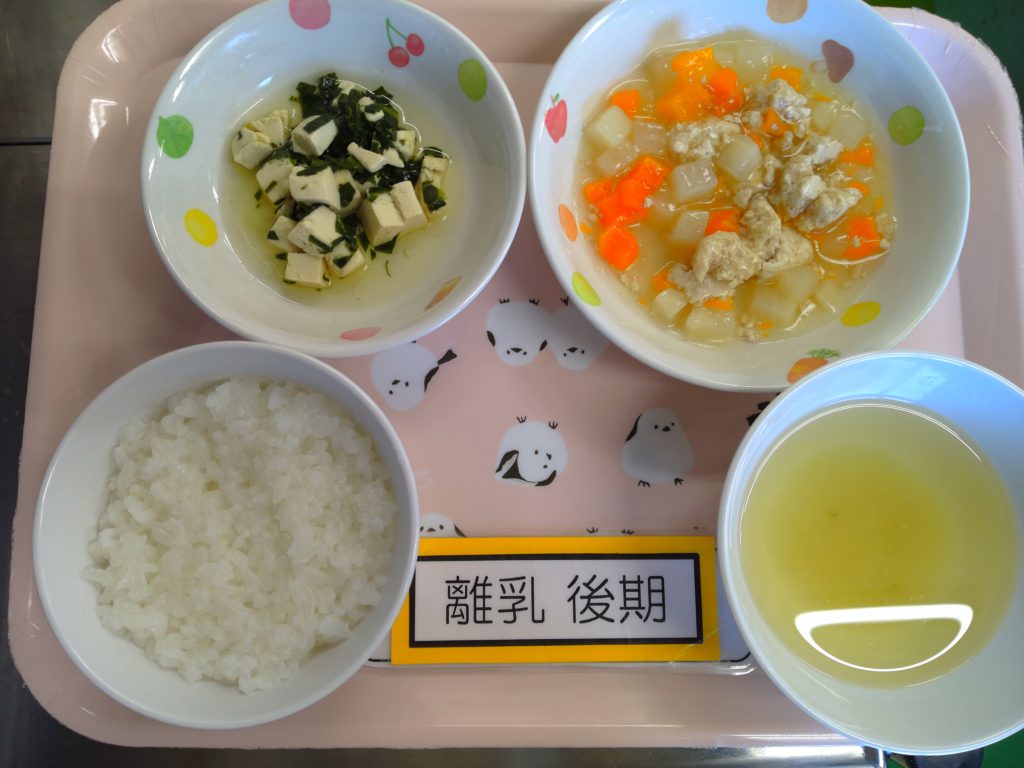 ホーム虹の子保育園今日の給食 4月8日(水)の給食 2026年4月8日 【今日の給食】ご飯 炒り鶏 きゅうりとわかめの酢の物 みそ汁 【離乳食 後期】軟飯 鶏肉と大根の煮物 豆腐と小松菜のやわらか煮 みそ汁 【午後おやつ】牛乳 パワフルおにぎり 【午後おやつ 離乳食 後期】ミルク おじや