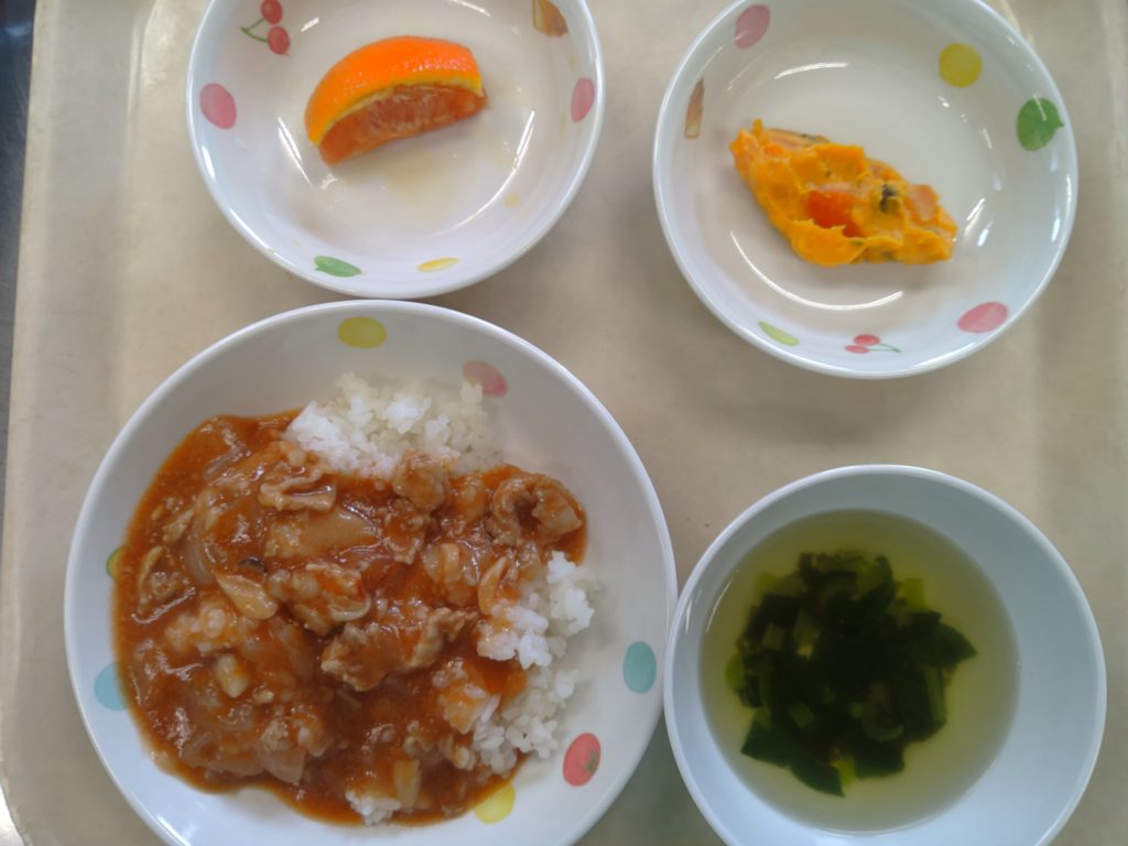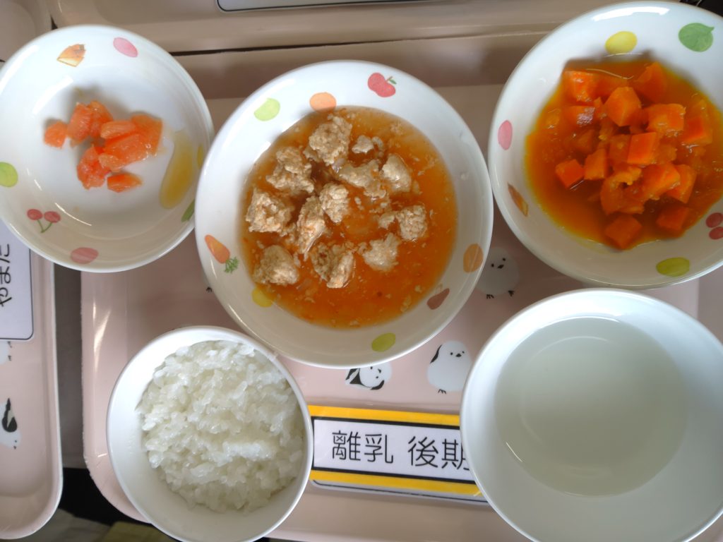 【昼食 離乳後期】ごはん 鶏肉のトマト煮 かぼちゃと人参のコロコロ煮 だし汁 オレンジ