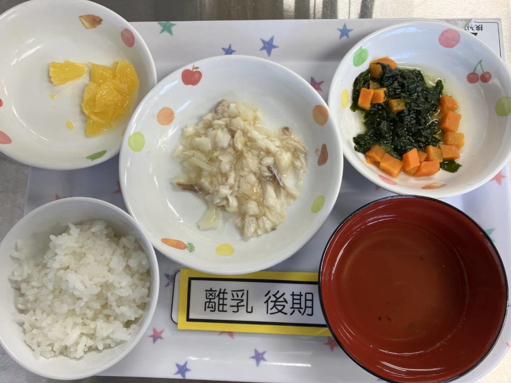 【離乳食 後期】軟飯 タラとキャベツの煮つけ ほうれん草と人参のだし煮 だし汁 オレンジ