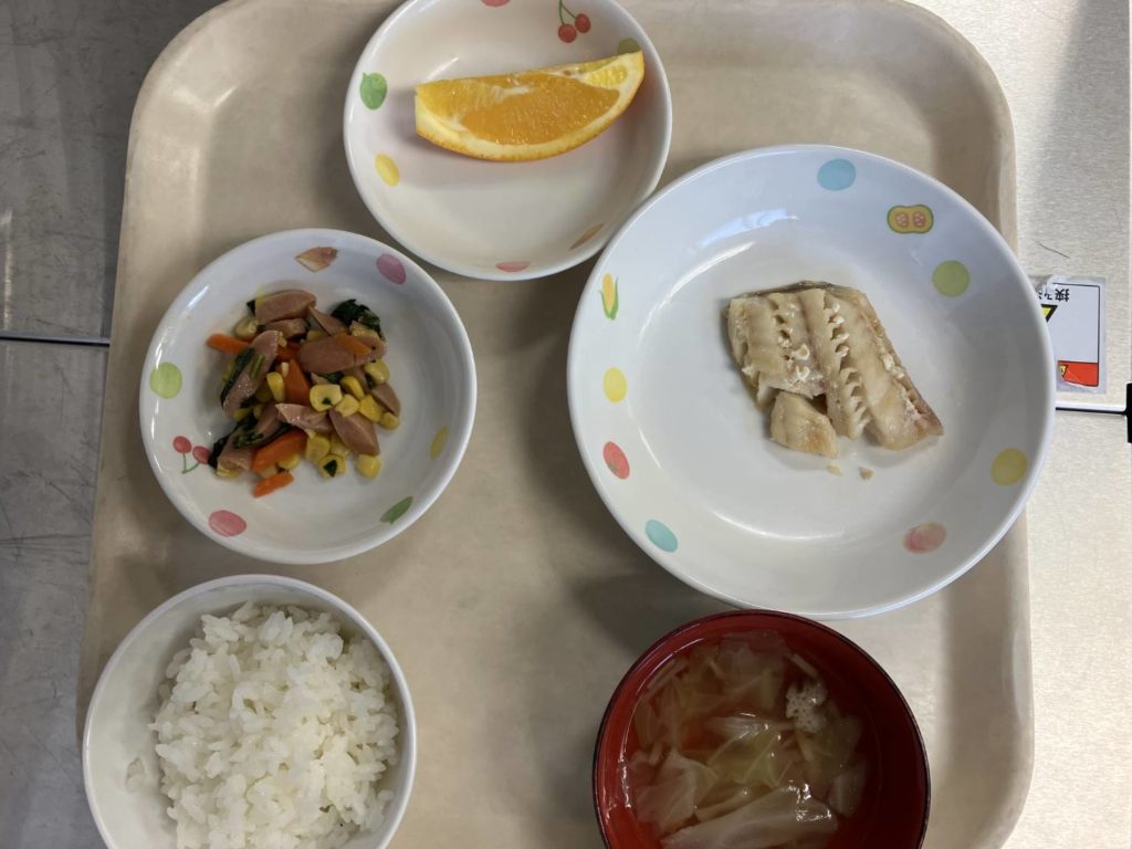 【今日の給食】ご飯 タラの甘辛揚げ ウインナーのポパイソテー スープ オレンジ