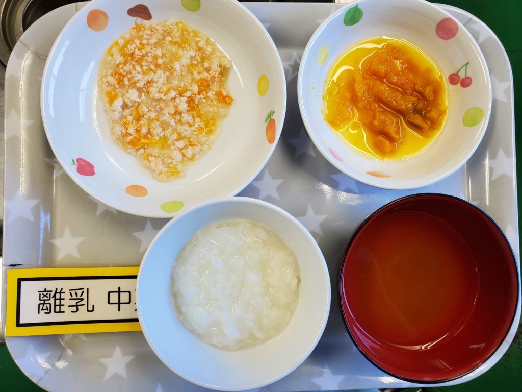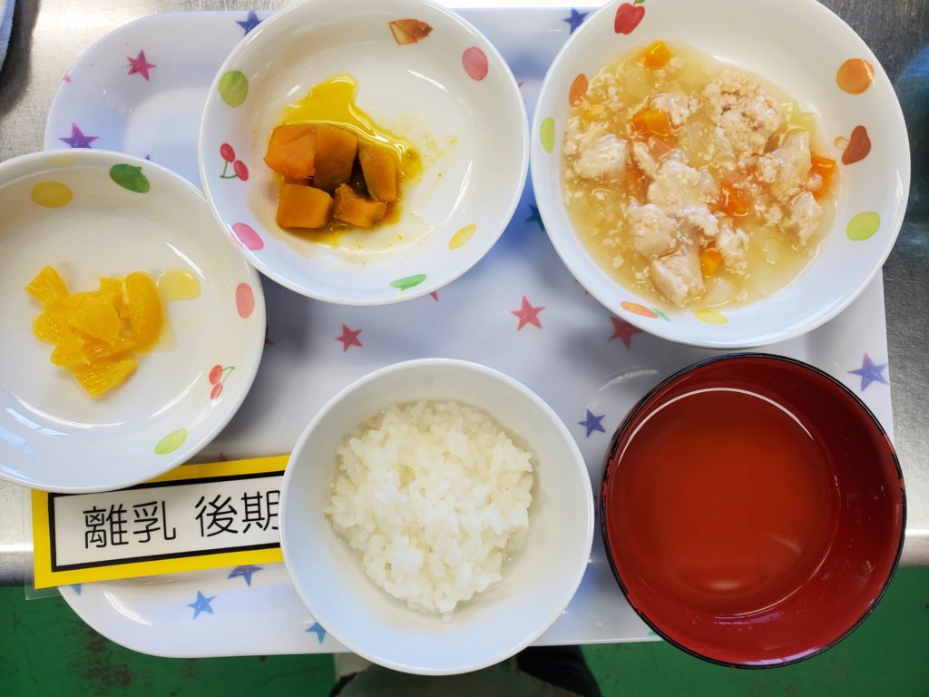 【離乳食 後期】軟飯 鶏肉とキャベツのやわらか煮 かぼちゃ煮 だし汁 オレンジ