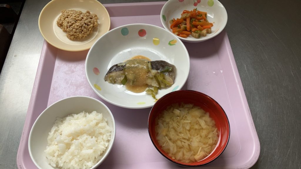 【今日の給食】納豆ご飯 白身魚の味噌煮 きんぴらレンコン すまし汁