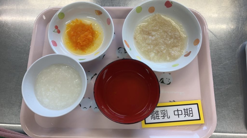 【離乳食 中期】おかゆ 白身魚の煮つけ 人参のだし煮 だし汁