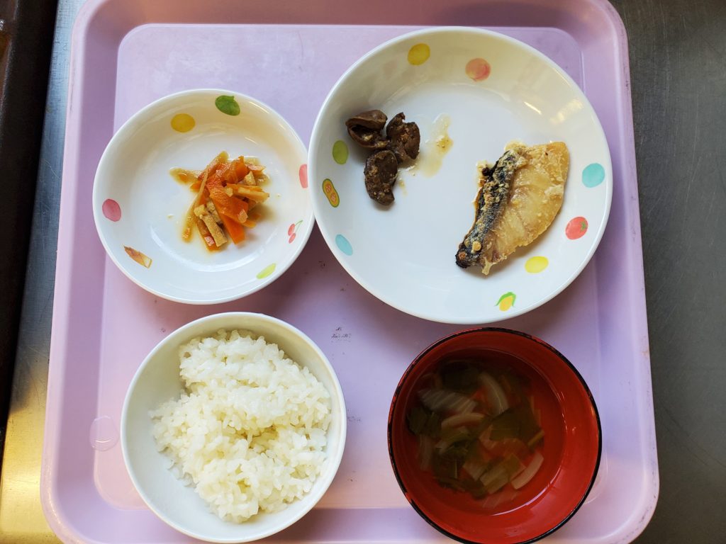 【今日の給食】ご飯 白身魚の西京焼き 鶏レバーの味噌煮 切干大根の煮物 すまし汁