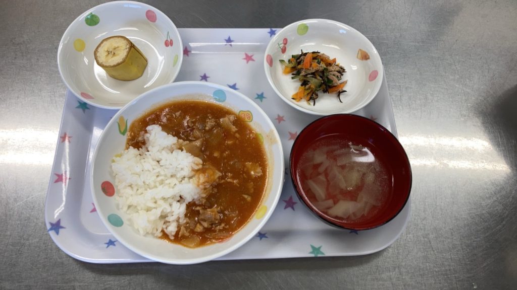 【今日の給食】ハヤシライス ひじきのサラダ スープ バナナ