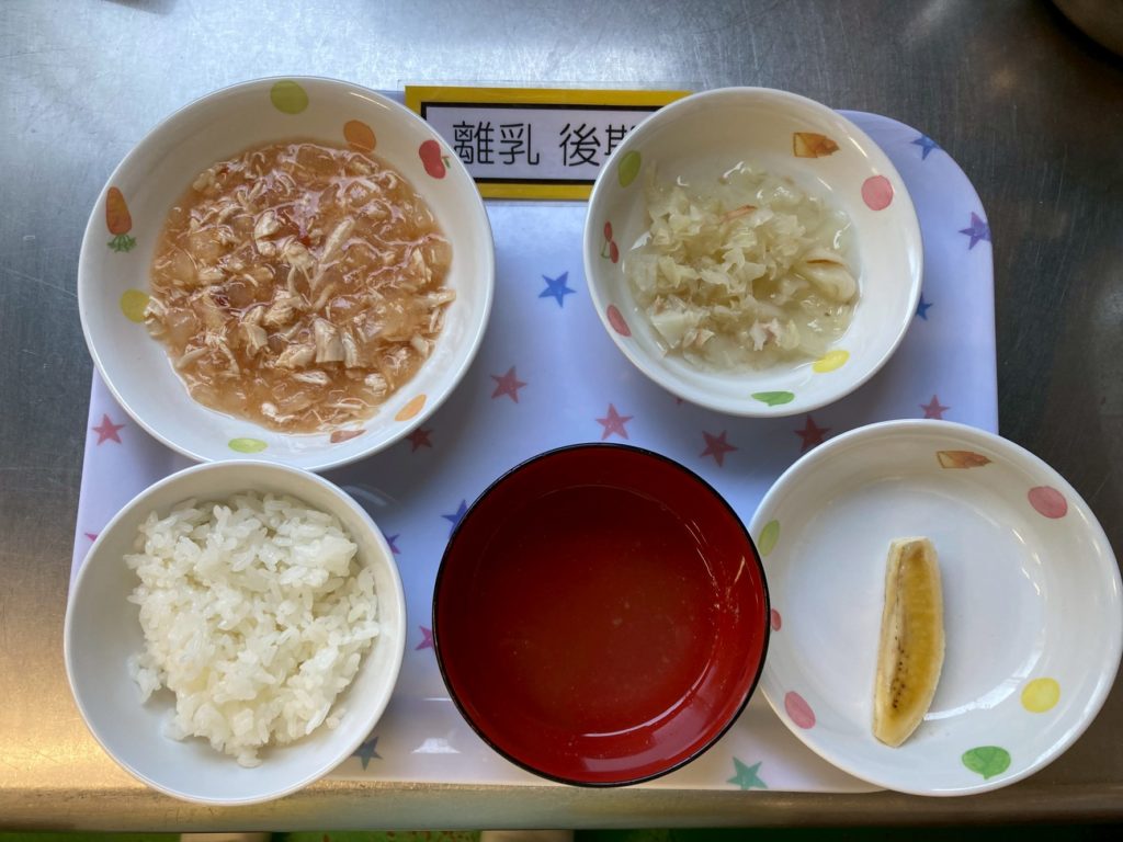 【離乳食 後期】軟飯 鶏肉と玉ねぎのトマト煮 ツナとキャベツのお浸し だし汁 バナナ